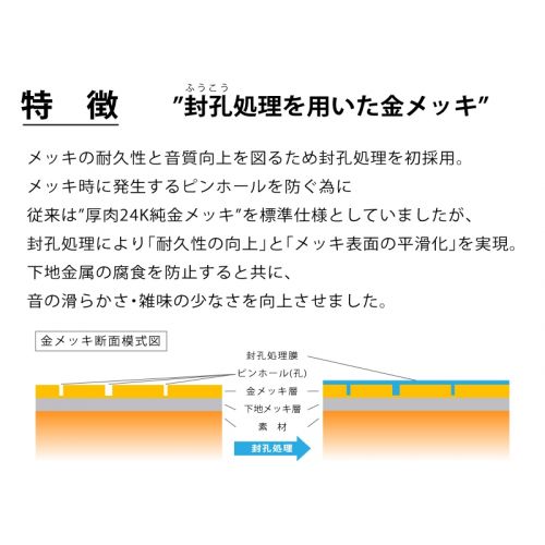 P-4.4/5Gはメッキ厚を増やした24K純金メッキなので、必然的にピンホールの数は少なくなり、封孔処理は必須工程ではありませんが、音響用プラグとしての拘りとして接触抵抗の軽減に最大限の努力を惜しみません。封孔処理によりマイクロレベルのメッキ表面の平滑化され、接触抵抗を低く保ち安定させる効果があります。幾多の試作品を試聴テストを繰り返した結果でも「音の滑らかさ」「雑味の少なさ」が飛躍的に改善。過去オヤイデ電気プラグ史上、最大の金メッキ特性を保持しています。